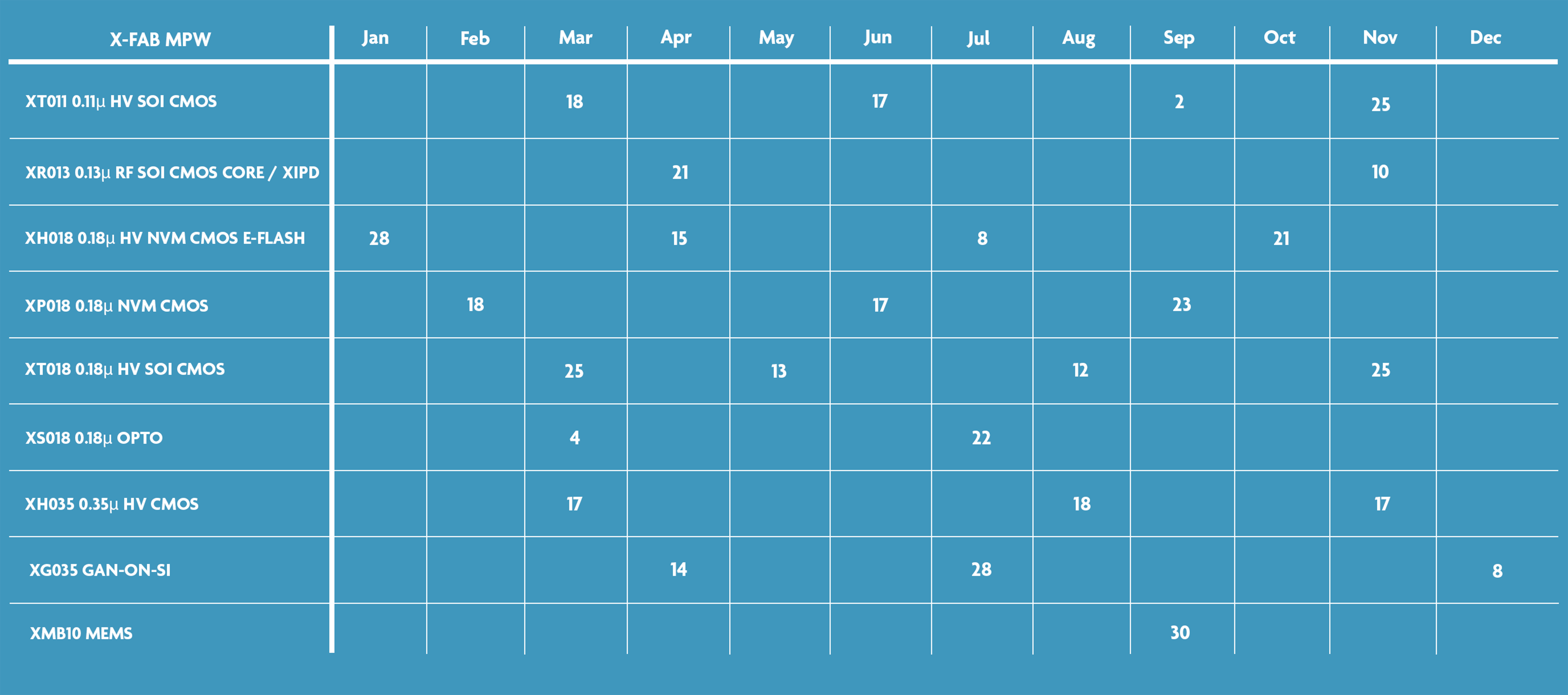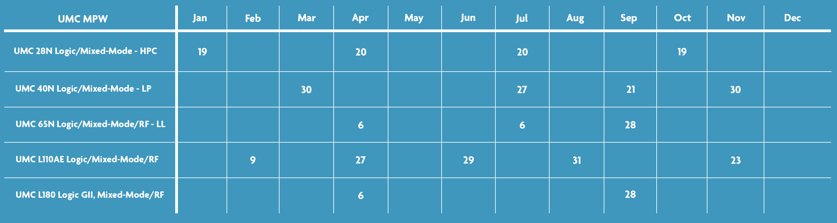 IC-Link offers the Multi-Project Wafer (MPW) services through leading foundries and fabs. Find out the detailed submission schedules below.
